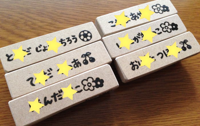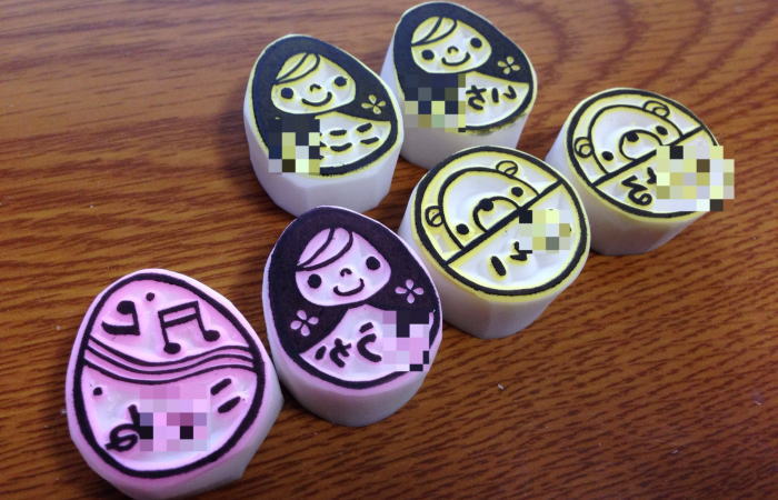 入園・入学にもお使いいただける「お名前はんこ」のオーダーも、受け付けています。たくさん押すお子さんへのお名前に、こういった感じで使ってみてはいかがでしょうか?